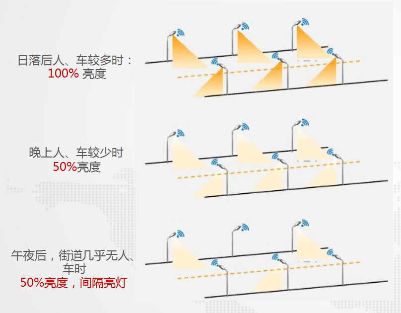 可以設(shè)置特殊的照明控制策略,在節(jié)假日期間或者人流量較大的地段,實現(xiàn)區(qū)別性的照明計劃;與其他系統(tǒng)聯(lián)動,在事故發(fā)生地段加強照明亮度;實時指定某些地段的照明亮度。