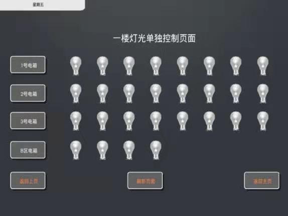 下圖為該項(xiàng)目的智能照明控制軟件截面圖,如圖所示,有電箱內(nèi)的回路單控,也有以樓層為單位作區(qū)域燈光控制的選項(xiàng),以及所有系統(tǒng)內(nèi)的燈光一鍵全開(kāi)全關(guān)的功能。