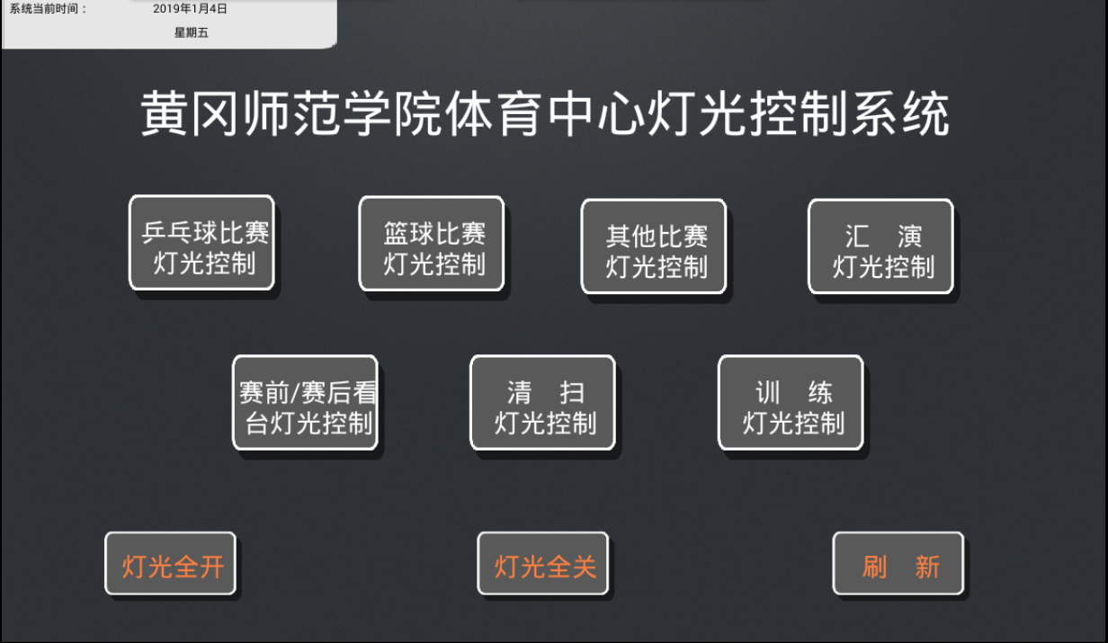 VSU為黃岡師范學院體育中心實現燈光智能化控制,多種燈光場景模式任意切換,一鍵開閉館內所有燈具。我司根據客戶需求設置了以下燈光場景模式:乒乓球比賽、籃球比賽、其他比賽、匯演、賽前/賽后、清掃、訓練、全開、全關。