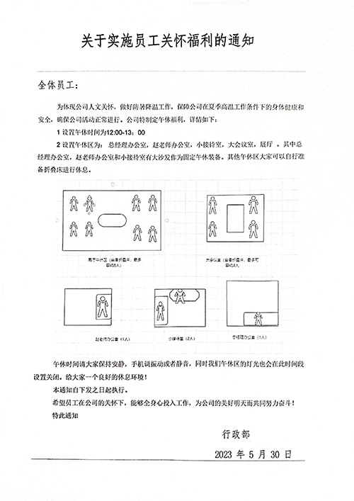 公司設(shè)置了午休區(qū)并購置了"午休神器",神器寬大柔軟,如折疊睡墊;配備的緩解頸部勞累的充氣枕,釋放了上午工作的疲勞。讓員工在午休時間休息好,養(yǎng)足精神,不是一件小事。該通知讓員工感受到了企業(yè)大家庭的溫暖,也是企業(yè)人文關(guān)懷的真情體現(xiàn),獲得大家的一致好評點(diǎn)贊,也使得下午的工作更加投入用心。