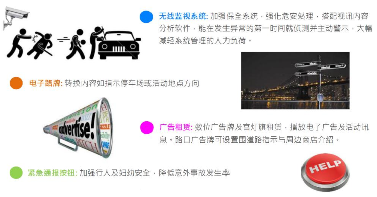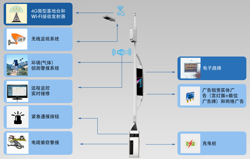 智慧路燈桿是一種集成各種信息設(shè)備技術(shù)創(chuàng)新復(fù)合應(yīng)用的智慧路燈產(chǎn)品,整個智慧燈桿內(nèi)包含路燈照明控制系統(tǒng)、WIFI天線基站、視頻監(jiān)控管理、廣告屏播控系統(tǒng)、城市環(huán)境實(shí)時監(jiān)測、緊急呼叫系統(tǒng)、水位監(jiān)測、充電樁系統(tǒng)和井蓋監(jiān)測系統(tǒng)等應(yīng)用。