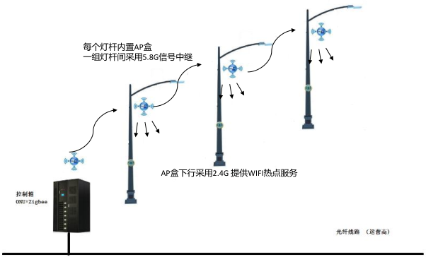 采用運(yùn)營商光纖網(wǎng)絡(luò)比無線4G更加穩(wěn)定,在不具備部署光纖的區(qū)域,可以使用4G微基站。采用5.8G信號在燈桿間做Mesh,同時提供下行2.4G頻段作為AP上網(wǎng)使用。