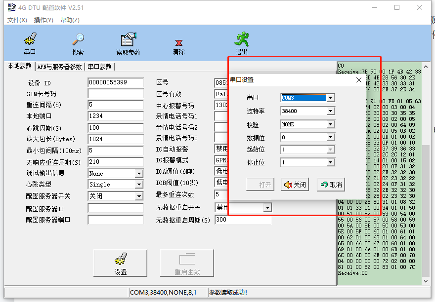 首先DTU設(shè)備不要上電,準(zhǔn)備USB轉(zhuǎn)RS485通信線接入DTU A B,USB線插入電腦,電腦在設(shè)備管理器找到相應(yīng)COM口,打開軟件4G DTU配置軟件設(shè)置相應(yīng)波特率參數(shù)即可,一般波特率設(shè)置先38400,設(shè)備上電(如果38400找不到設(shè)備,應(yīng)使用19200或9600來交替進(jìn)行。)具體操作詳見DTU設(shè)置說明。